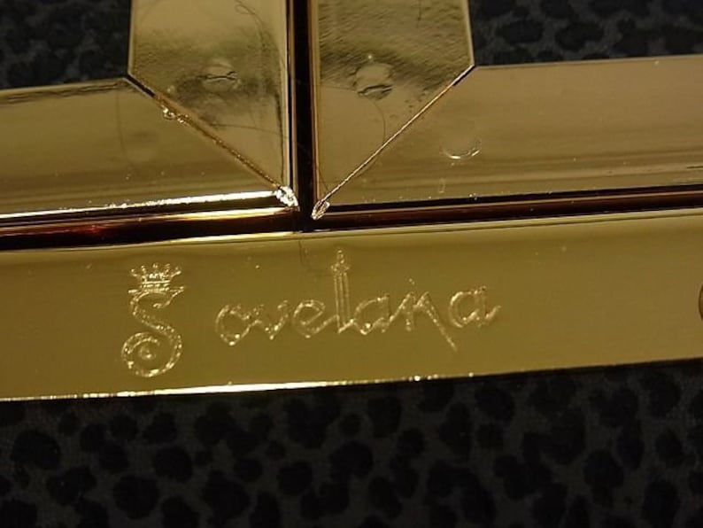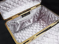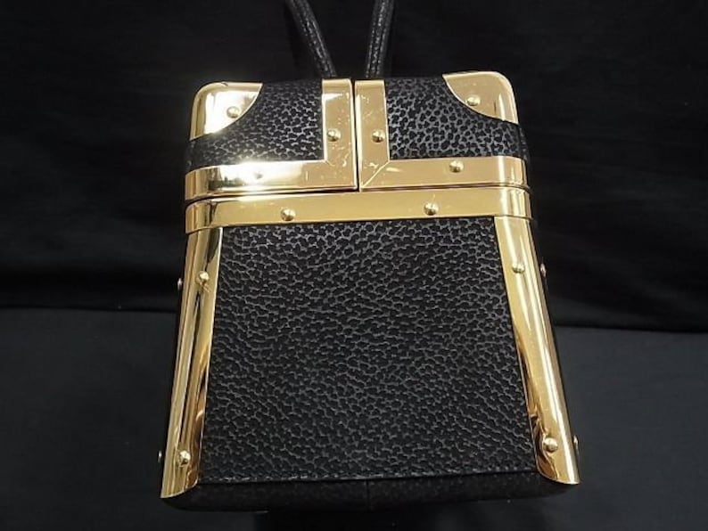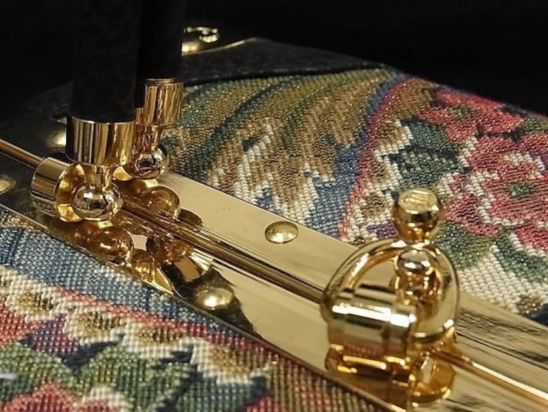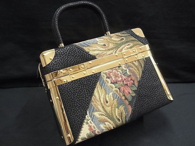 Stunning gold riveted corners and frame accents give the bag a structured, jewelry-box-like silhouette, while the sturdy leather handle adds comfort and sophistication. Perfect as an accessory to elevate your finest kimono or as a standout piece for formal or creative attire, this handbag is both functional and collectible.