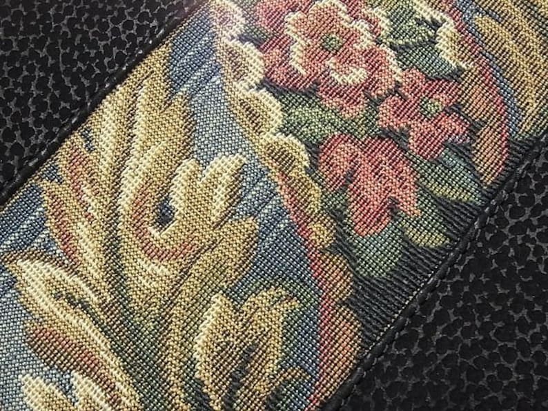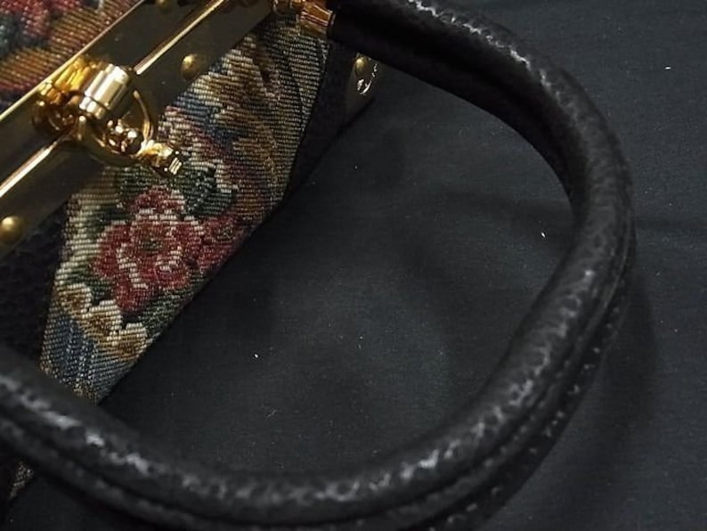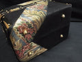 This exquisite vintage Japanese handbag from Kimonoya Kokoro Sovetana is a true fusion of traditional craftsmanship and timeless elegance. Made with luxurious silk obi fabric, the floral tapestry is beautifully framed by gleaming gold-tone hardware, evoking a sense of regal charm. The design blends intricate Coblanc-style weaving with deep black textured panels and vibrant woven floral motifs, highlighted with soft gold and rich rose tones.